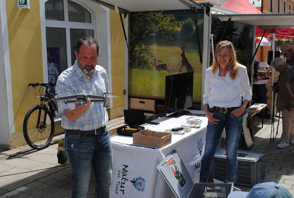 Eine echte Bereicherung waren einmal mehr die Info-Stände. Verdiente Aufmerksamkeit fanden vor allem Birgit und Christian Fruth mit der Vorstellung einheimischer Wildtiere und der mit einer Wärmebildkamera ausgestatteten Drohne, die sie Richtung Pestkapelle steuerten. Der Einsatz dieser Technik macht deshalb Sinn, wie die beiden Repräsentanten der Hegegemeinschaft Wörth erklärten, weil sie einen effektiven Schutz für gefährdete Rehkitze ermöglichen würde. In einem Weizen- oder Rapsfeld könnten sie nämlich leicht aufgespürt und vor der Ernte in Sicherheit gebracht werden.