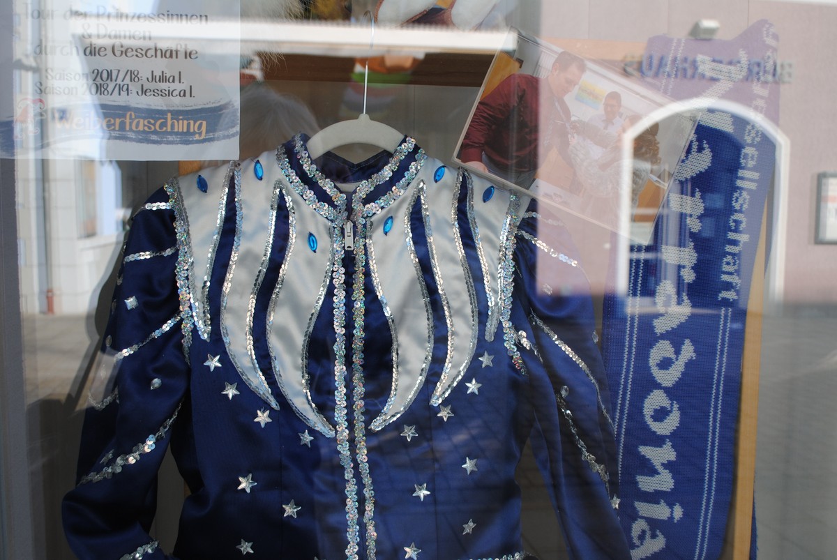 Bemerkbar machen kann sich die Gruppe durch das Entgegenkommen des Werbekreises. Kostüme, Kappen und Perücken, unverzichtbare Accessoires und Rückblenden in Wort und Bild, die an die tollen Tage des Teams vor Corona erinnern, schmücken seit Samstag mehrere Auslagen im Zentrum der Stadt. Charakteristische Garderobe und typisches Zubehör, das zum Erscheinungsbild eines Gardemädchens, Elferrats und Zeremonienmeisters gehören wie der Harlekin zum Hofstaat, wollen jetzt bei der Raiffeisenbank, am Eingang zum Gasthof Geier, in der Bäckerei Deubel, der Metzgerei Zankl und der Hof-Apotheke, im Schuhhaus Weichser, im Hörhaus und bei City Hair sowie bei den Firmen Hausladen und Schuller die Aufmerksamkeit auf sich ziehen.