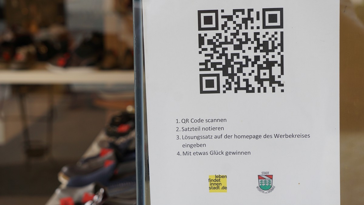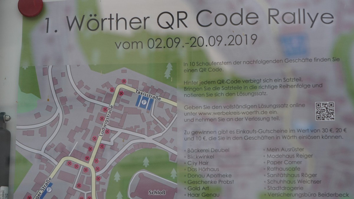 In zehn Schaufestern – Bäckerei Deubel, Blickwinkel und Kumpfmüller, Geschenke Probst, Modehaus Reiger, Hörhaus, Hartung´sche Buchhandlung, Rathauscafe, City Hair, Hair Chalet und Haar Genau, Hof- und Donau-Apotheke, Gold Art und Land-Ei, Sanitätshaus Röger, Schuhhaus Weichser, Stadt Drogerie, Paper Corner und Versicherungsbüro Beiderbeck - befindet sich ein QR-Code mit einem Satzteil, der in der richtigen Reihenfolge des Rätsels Lösung ergibt. Das Ergebnis kann unter der Internet-Adresse „www_werbekreis-woerth.de“ mitgeteilt werden. Und mit etwas Glück kann der Teilnehmer bei dieser Premiere einen Gutschein im Wert von 30, 20 und 10 Euro gewinnen und sich in den Fachgeschäften einen Wunsch erfüllen.