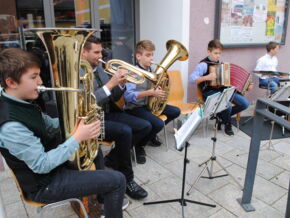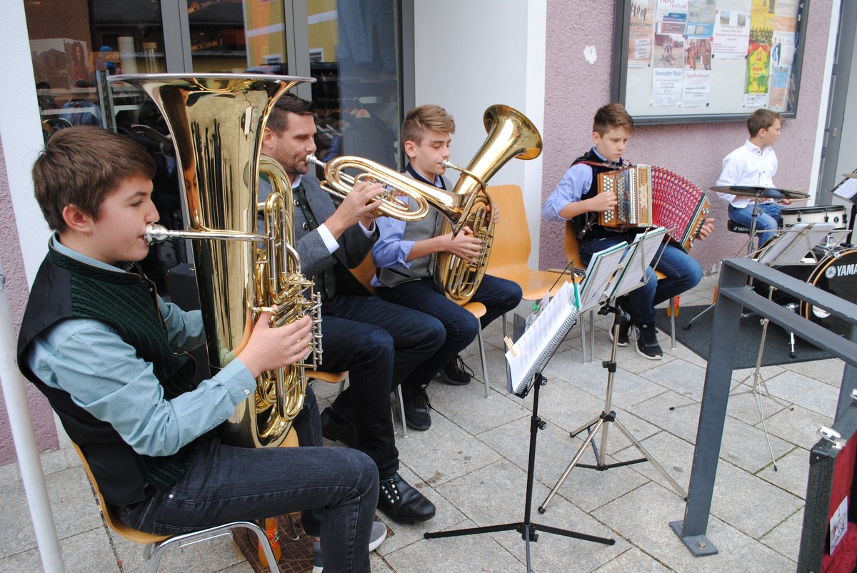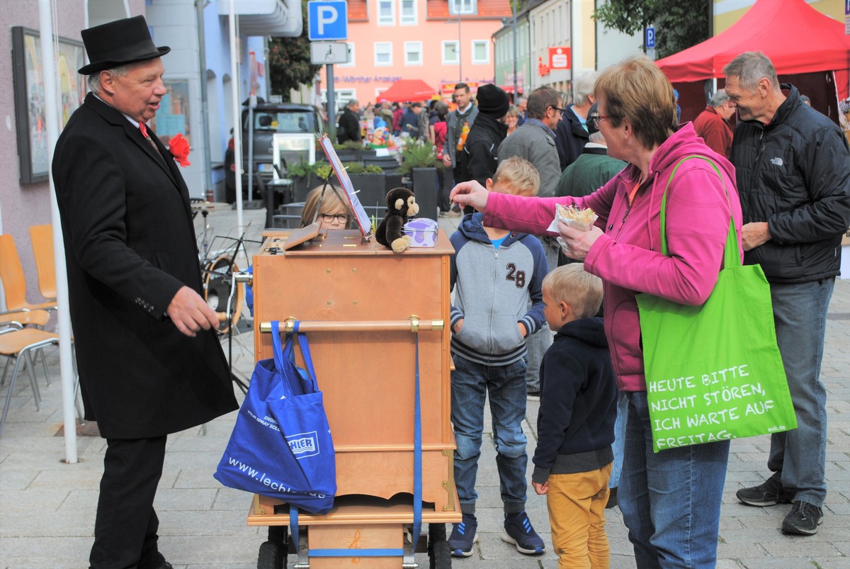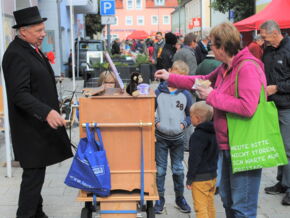 Angenehme Begleiter bei diesem Rundgang waren die jungen Instrumentalisten der Gruppe „Sakrisch guad“, die bei der Musikschule einige Lieder anstimmten, und Leierkastenmann Scheibenpflug aus Pfatter, der – wie immer – Spenden für einen humanitäre Organisation sammelte, die Menschen in Not mit Rat und Tat zur Seite steht. Er leistete bei aufgeschlossenen und wohlwollenden Frauen und Männern keine Fehlbitte.